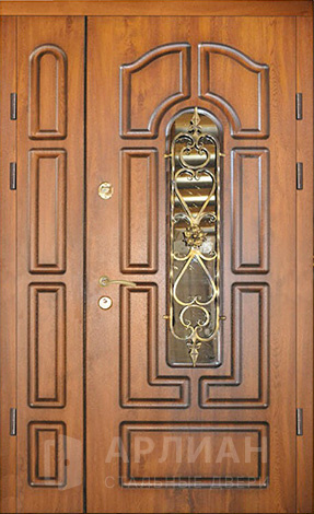 Двухстворчатая входная дверь со стеклом и ковкой №9
